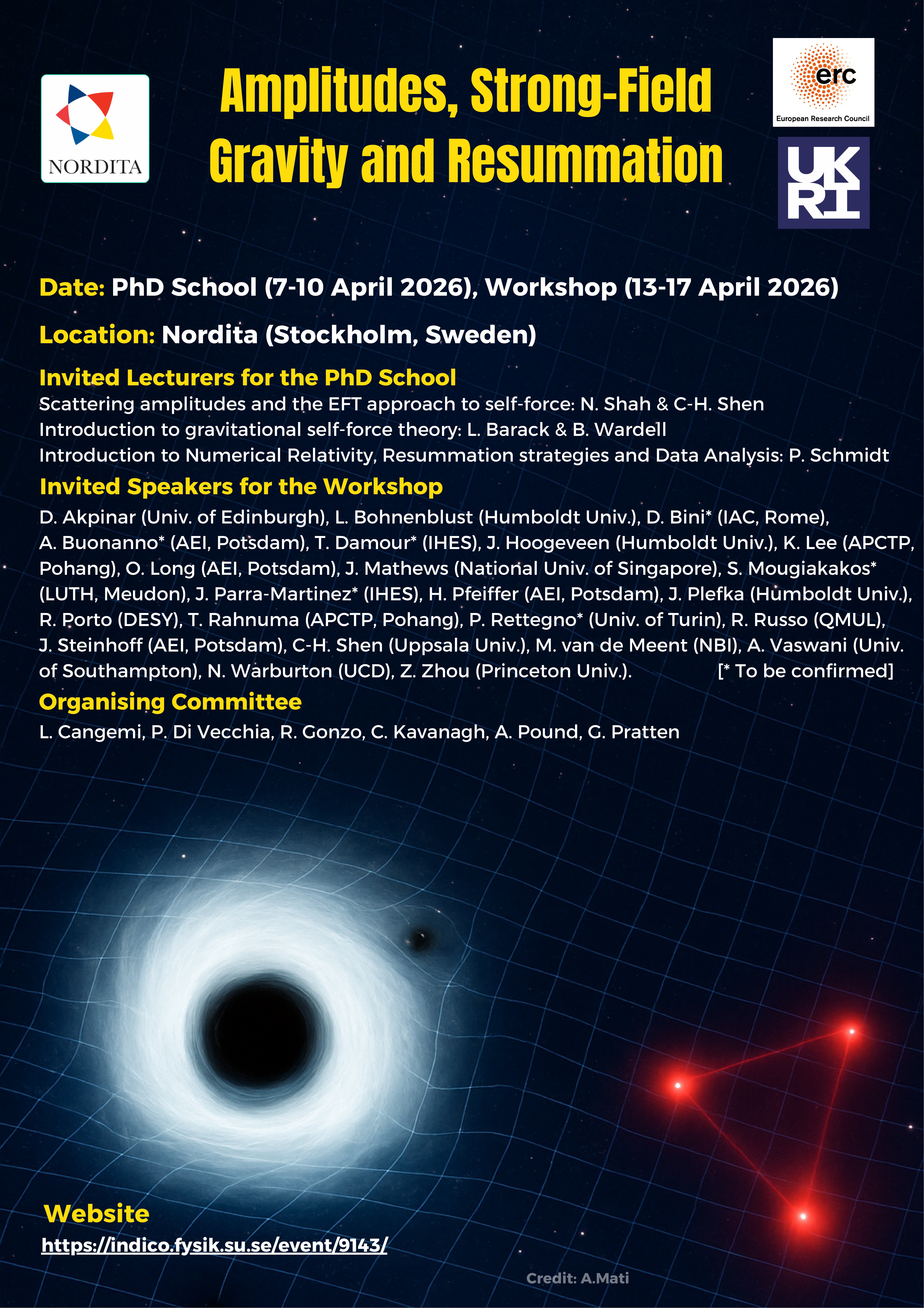 Week 2 [April 13–17, 2026 (5 days)]: Workshop focused on uniting the weak-field (PM) and strong-field (GSF) approaches to the two-body problem, as well resummation strategies relevant for gravitational-wave phenomenology. Individual talks will be complemented by discussion sessions to promote cross-community interaction and constructive debates.